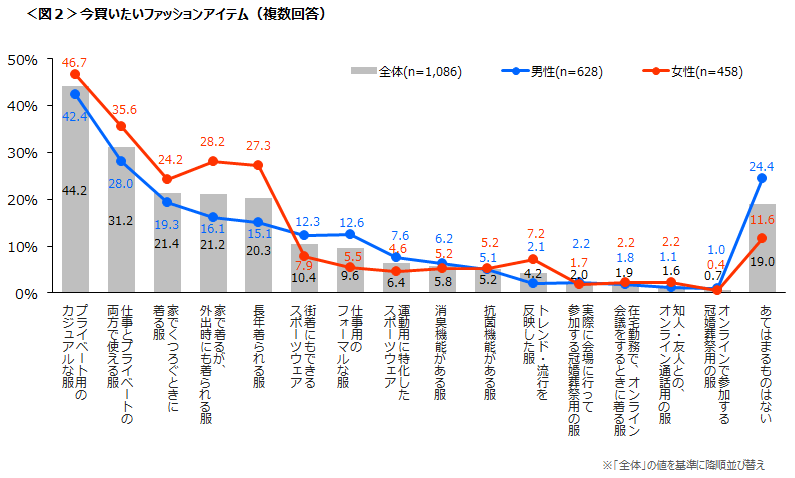 今ほしいファッションアイテムは、「プライベート用のカジュアルな服」、「仕事とプライベートの両方で使える服」が上位2項目。3位をみると、男性では「家でくつろぐときの服」が挙がり、女性では「家で着るが、外出時にも着られる服」が挙がる。