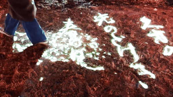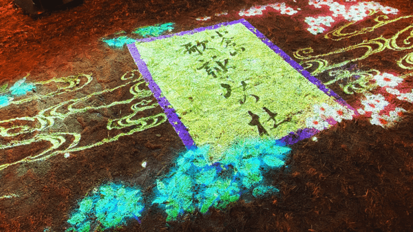 音楽に合わせて変化するやわらかな灯りの中で、足元に浮かびあがる和歌に触れると、四季をイメージした映像が地面いっぱいに広がります。