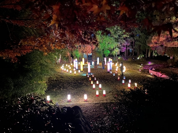 『~四季の灯りと戯れる~歌詠みの杜』は、嵯峨・嵐山地域とゆかりの深い小倉百人一首で詠まれている季節の和歌をテーマに「音」、「光」、「映像」、「香り」が創り出す幻想的な空間です。