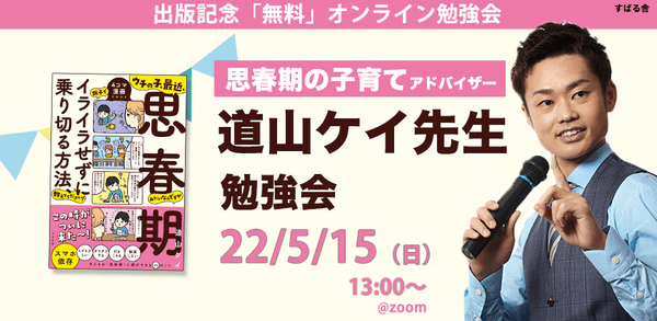 1万組以上の親子をサポートした、”思春期の子育てアドバイザー”道山ケイ先生新刊『ウチの子、最近、思春期みたいなんですが親子でイライラせずに乗り切る方法、教えてください!』出版記念【無料オンライン勉強会】5月15日(日)13時より開催!