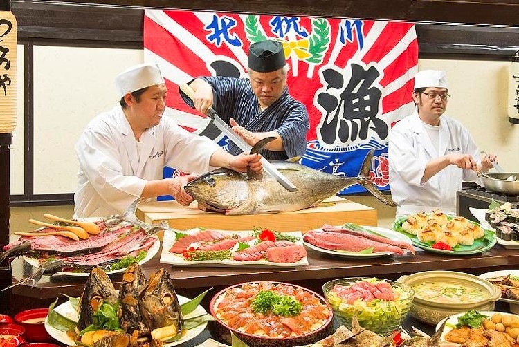伊豆大島と海を一望するテラス付きレストランでは、伊豆の新鮮な造りや寿司、金目鯛の煮付け、揚げたて天麩羅、海鮮BBQ、サイコロステーキなど、大人も子供も満足できる60種以上をお召し上がりいただけます。毎週火曜と金曜日は、“マグロの一刀おろし”も開催。捌きたての中落ちや中トロをご賞味ください。