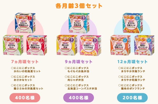 本キャンペーンでは、お子さまの月齢に合わせて応募できるように「7ヵ月頃セット」「9ヵ月頃セット」「12ヵ月頃セット」の3種類を用意しました。簡単なアンケートに回答いただいた方の中から、「にこにこボックス 3個セット」と「にこにこボックス ランチョンマット」を抽選で7ヵ月頃セット400名・9ヵ月頃セット400名・12ヵ月頃セット200名、計1,000名様にプレゼントする企画です。