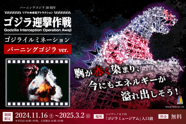 兵庫県立淡路島公園アニメパーク「ニジゲンノモリ」内にある人気アトラクション「ゴジラ迎撃作戦」では、1995年に 公開された『ゴジラVSデストロイア』がまもなく30周年を迎えることを記念し、毎年大好評の「ゴジライルミネーション」を“バーニングver”として2024年11月16日(火)~2025年3月2日(日)の期間限定で、「ゴジラミュージアム」前に設置しております。
