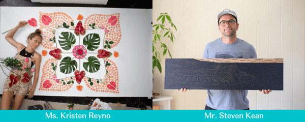 賞品:ADAM ET ROPE'とコラボしたアロハシャツを20名様(Twitter:10名、Instagram:5名、Facebook: 5名)にプレゼントします。ハワイアンの主食であるタロイモの版画アートをスティーブン・キーン氏(右)が、そしてハワイの個性豊かで色とりどりのフルーツの写真アートをクリステン・レイン氏(左)がデザインしました。