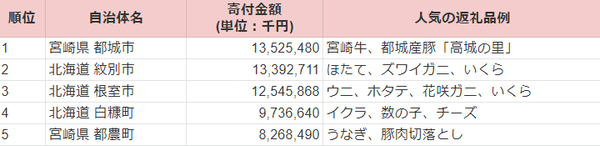 ・上位5位中、北海道から3つの自治体がランクイン。海鮮が人気