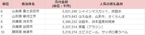 6位から10位の自治体は、寄付金額に大きな開きがありませんでした。