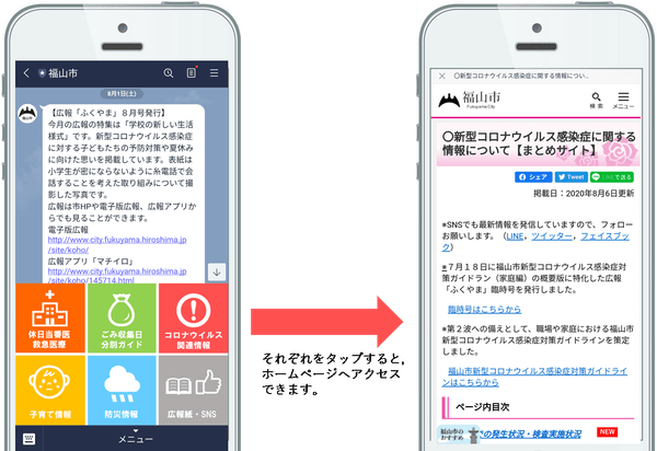 福山市公式アカウントでは,メッセージ配信のほかにも,①休日当番医・救急医療 ②ごみ収集日・分別ガイド ③コロナウイルス関連情報 ④子育て情報 ⑤防災情報 ⑥電子版広報紙へアクセスできるメニューも配置しており,必要な情報をすぐ見ることができます。