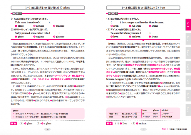 また、「絵に描ける or 描けない」「始まりと終わりがあるorない」などパターン別に200の例題を挙げ、そのひとつひとつにわかりやすい解説を添えました。さらに、100の確認テスト問題も掲載。これらを解きながら、冠詞のセンスを身につけることができます。