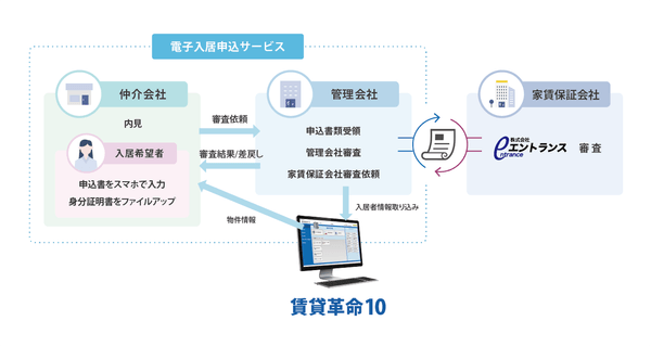 入居申込をオンラインで完結する日本情報クリエイトの「電子入居申込サービス」とエントランスが提携を行うことにより、家賃保証サービスをご利用いただく入居希望者様、仲介会社様、管理会社様はこれまでと比較して、手書きでの保証申込書作成の手間や記載漏れの確認などのストレスが少ない、スムーズな保証審査が可能となります。
