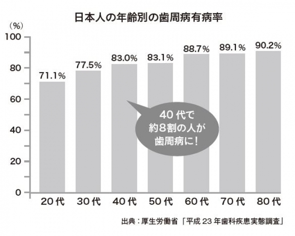 歳をとると、口の中の環境が変わって、歯周病菌が増えやすくなります。この歯周病は日本人の大人のほとんどが患っている、いわば国民病。その発症率は35歳前後からぐんぐん上がっていき、40代になるころには、なんと8割もの人が歯周病を発症します。実は、若い人の口の中にも歯周病菌はたくさんいるのです。
