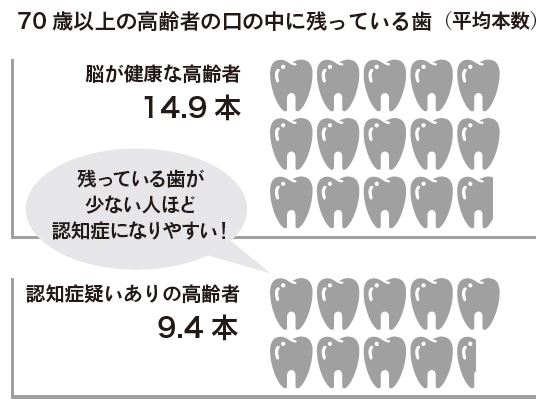口の中に残っている歯の数と認知症発症率には、相関関係があります。東北大大学院の研究グループが、70歳以上の高齢者を対象に行った調査によると、「脳が健康な人」の歯は平均14・9本でしたが、「認知症疑いあり」と診断された人はたったの9・4 本でした。