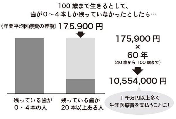 日本歯科医師協会が、全国の40歳以上、約1万9000人を対象に行った調査では、残っている歯の数が20本以上ある人は、0~4本の人よりも、年間の医療費が平均で17万5900円も低いという結果が出ました。この金額を1日あたりに換算すると、17万5600円÷365日=約482円。つまり、歯を20本以上キープする歯のケアを続けるだけで、毎日約500円もの医療費を得することになるのです。