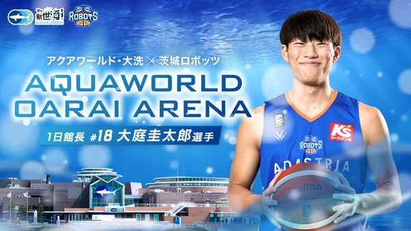 「サメの飼育種類数日本一」のアクアワールド茨城県大洗水族館では、地元・茨城県のプロバスケットボールチーム「茨城ロボッツ」とコラボレーションし、茨城をさらに盛り上げる特別イベントを今年も開催します。3回目を迎える今年は大庭圭太郎選手を1日館長としてお迎えし、イルカ・アシカオーシャンライブに特別出演する1日館長DAYを2024年2月25日(日)に開催するほか、茨城ロボッツの選手がプロデュースした特設水槽の展示など、水族館とバスケットボールの魅力が融合したスペシャルイベントとなっております。