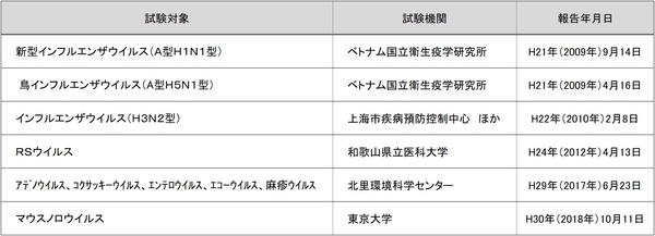 当社はこれまでにも、鳥インフルエンザウイルス(A型H5N1)やインフルエンザウイルス(A型H1N1)、マウスノロウイルス、食中毒の原因となる毒素や細菌といった有害物質に対して、大学及び公的研究機関と共同で効果実証してきました。