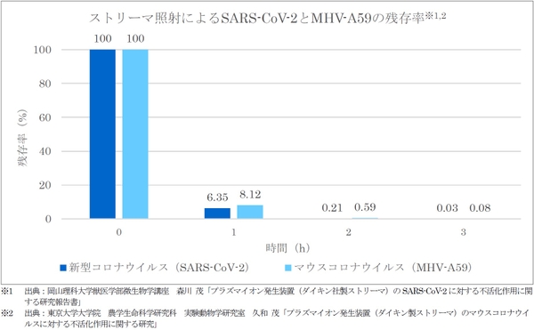 ストリーマを1時間照射することにより新型コロナウイルスは93.6%、マウスコロナウイルスは91.8%不活化された。