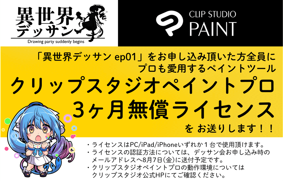 今回、デッサン会へ参加者される方全員にPC/iPad/iPhoneいずれか1台で使用できる「クリップスタジオペイントプロ」3ヶ月ライセンスをお送りいたします。これを機に、プロも愛用するツールでデッサン会に臨んでみてはいかがでしょうか。