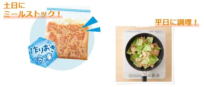 調理時間を賢く使って自分の大切な時間を創出(“時産”)することです。週末にドレッシングで下味を付けて冷凍保存し、平日に冷蔵庫で解凍し加熱調理する「作り置き冷凍」で、毎日の献立をお手伝いします。