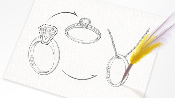 ケイ・ウノでは、これまでも母、義母、祖母などから譲り受けた婚約指輪のダイヤモンドを、新しいデザインの婚約指輪に作り替えるリフォームを提供しています。このほど、自身の結婚を機に家族の絆や感謝の想いを伝える企画として、ダイヤモンド以外の金属部分を活かしたサービスを開始します。譲り受けた指輪の内側に刻印された文字などがある場合も、そのままシンプルなリング状のペンダントトップとして両親へのお返しの品とすることができます。ネックレスチェーンに通して身に着けることも可能です。