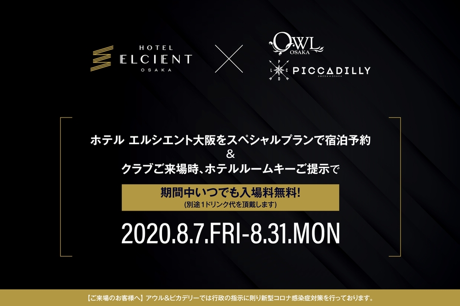 「ホテル エルシエント大阪」×「OWL OSAKA & CLUB PICCADILLY」 特別コラボプラン販売 ~ホテルルームキー提示で、期間中入場料がいつでも無料に~|8月7日~8月31日