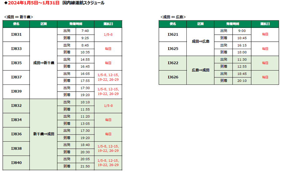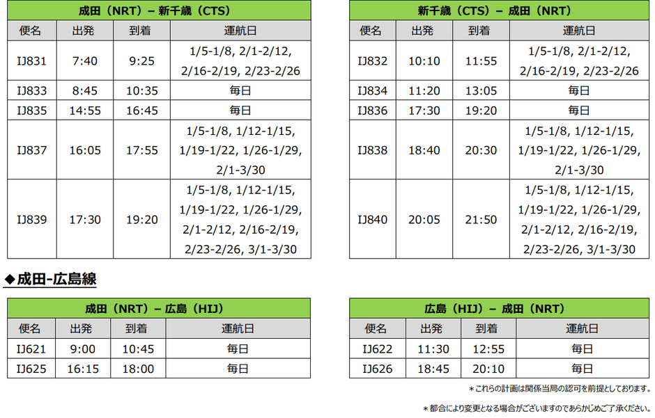 2023年11月17日 13:00JALグループのLCCであるスプリング・ジャパン株式会社(以下:スプリング・ジャパン)は本日15時より、2024年1月5日(金)から3月30日(土)までの成田=新千歳線、広島線の販売を開始します。