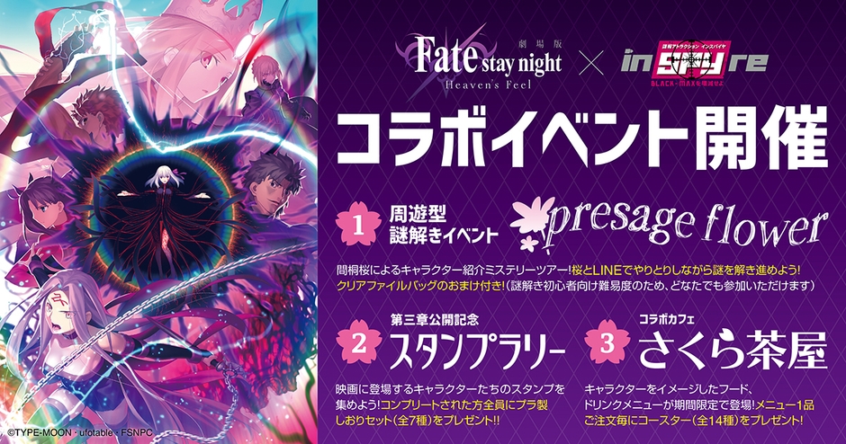 レジャー施設・多目的ホール等の開発、経営、管理を行う株式会社ヒューマックスエンタテイメント(本社:東京都新宿区、代表取締役社長:林 祥裕)は、2020年3月28日(土)~同年5月10日(日)に、新宿・歌舞伎町のスパイ体験アトラクション「inSPYre(インスパイヤ)」で、3月28日公開予定の劇場版「Fate/stay night[Heaven's Feel]」とのコラボ謎解きイベント「presage flower」をはじめ、3種類のイベントを開催します。