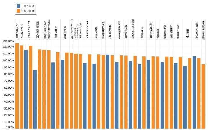 総視聴時間については、令和4年度(2022年度)は視聴を成績に反映させた科目があったとはいえ、ほとんどの科目で100%を超えており、学生はただ漠然と動画を見ているのではないということがわかります。倍速機能を利用している学生が7割近くいることを考えると、倍速機能と組み合わせながら繰り返し視聴していることが予想されます。