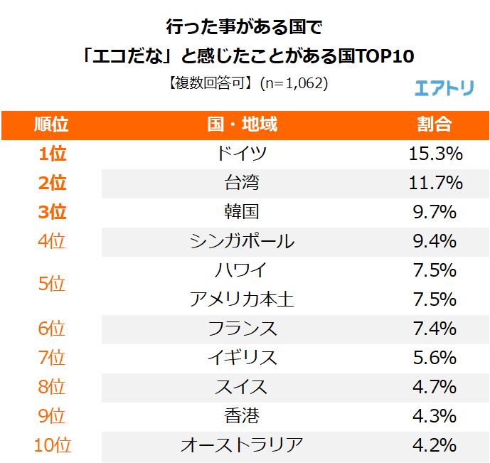 調査5:行った事がある国で「エコだな」と感じた事がある国TOP10【複数回答可】