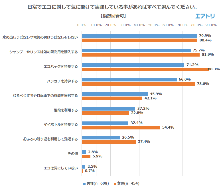 ―エコに対して気に掛けて実勢している事について、男性で最も多かったのは「水の出しっぱなしや電気の付けっぱなしをしない(男性:79.9%、女性:80.4%)」でした。女性で最も回答が多かったのは「エコバッグを持参する(男性:71.2%、女性:88.3%)」でした。