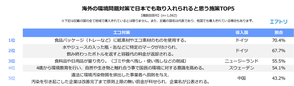 海外の環境問題対策で日本でも取り入れられると思う施策について聞いたところ、1位は7割以上の人が選んだドイツの「食品パッケージ(トレーなど)に紙素材やエコ素材のものを使用する。」という施策となりました。2位も同じくドイツの施策が選ばれ「水やジュースの入った瓶・缶などに特定のマークが付けられ、飲み終わったボトルを返すと容器代の料金が返却される。」でした。3位はニュージーランドの「食料品や日用品が量り売り。(ゴミや食べ残し・使い残しなどの削減)」との施策が選ばれ、TOP3はすべて飲食料に関連するものとなりました。