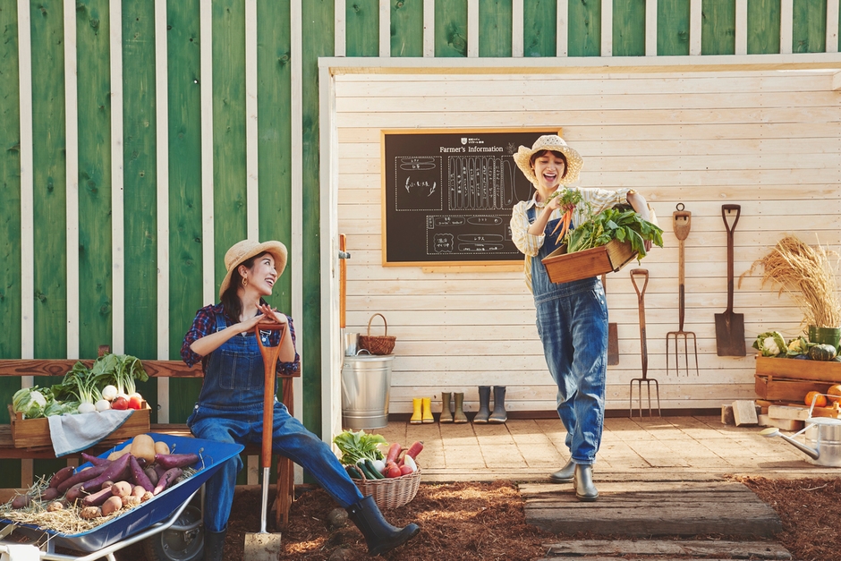 客室は、野菜に親しみながら過ごすことをテーマとした「ベジルーム」です。野菜がたっぷり入った冷蔵庫やスケール、ミキサーが用意され、滞在中はいつでも冷蔵庫から好きな野菜を取り出し、スムージーにして楽しめます。また、野菜と農をテーマにしたクッションや野菜石鹸などのアメニティが設えられる他、本プランで滞在中に摂る野菜の量を記録する「ベジログ」も用意されます。さらに、翌日施設内で行う農体験で着用するつなぎや長靴、手袋も備えられ、手ぶらで気軽に体験に参加するためのアイテムが客室内に整っています。