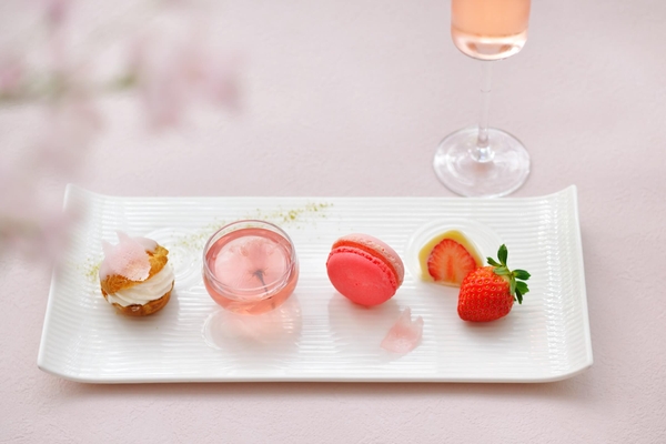 夜桜見物で味わうロゼワインは、上品な甘さとスパークリングのドライな味わいが楽しめる「ロゼスパークリング」です。スイーツは、桃が香るクリームを詰めた「桃のシュークリーム」、優しい塩味の「桜のジュレ」、「苺のマカロン」、濃厚なミルクを感じるホワイトチョコレートをまとった「ショコラと苺」です。桃の花が咲くことで春の訪れを感じ、そして桜が咲き、瑞々しい苺が実る、八ヶ岳の春の移り変わりを表現した4つのプティフールとロゼワインで夜桜見物を満喫します。
