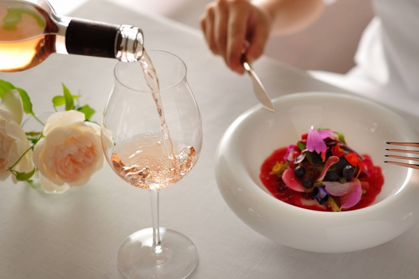 ディナーはメインダイニング「OTTO SETTE(オットセッテ)」で、イタリア料理のコースとワインを楽しみます。ワインのペアリングコースでは、登場することの少ないロゼワインをラインナップに加えたプラン限定のメニューです。ロゼワインと同じ、ピンク色が印象的な前菜を合わせてマリアージュを堪能します。