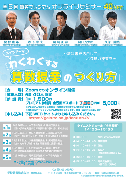 学校図書株式会社(本社:東京都北区 代表取締役社長 芹澤克明)は、2020年9月から全5回の算数オンラインセミナーを開催いたします。