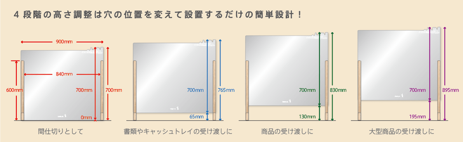 利用シーンに応じて、飛沫は防ぎながら下部に65mm、130mm、195mmいずれかのスペースをつくることができます。これにより、受け渡しがし辛い状況を解消します。