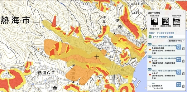 熱海市で土石流があったエリアのハザードマップ。急傾斜地の崩壊、土石流、地すべりといった項目で色がついている。黄は警戒区域、赤は特別警戒区域(出典:ハザードマップ)