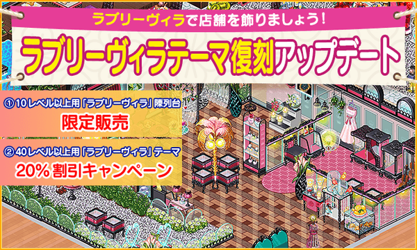 7月23日(木)~ 8月6日(木) メンテナンス前まで、「ラブリーヴィラテーマ」の「20%割引キャンペーン」を実施いたします。またmレベル10以上で購入可能な「ラブリーヴィラ陳列台」の限定販売も実施します。