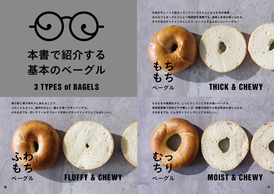 ふわもちベーグル◎ プレーン・はちみつとオートミール・アールグレイとオレンジピール・グリーンオリーブ、アンチョビ、タイム・よもぎ、小豆、きなこ/もちもちベーグル◎ プレーン・抹茶、クランベリー、レモンピール・黒糖、コーヒー、チョコレートチップ・プロセスチーズとローズマリー・ごまごま/むっちりベーグル◎ プレーン・シナモンとブルーベリー・いちじくとくるみ・ガーリック、オニオン、トマト・かぼちゃと豆乳/いろんなベーグル◎ クリスピーのプレーン・クリスピーの柚子、山椒、白味噌・マーブルのココアと練乳・マーブルのイカスミとパプリカ・おやきの野沢菜と青じそ・おやきの焼きいも、メープルシロップ、くるみ・プレッツェル・編み込みソーセージ/ベーグルサンドと楽しむ。クリームチーズ/ベーグルで楽しむ。サンドイッチ/コラムColumn◎ ①「粉で変わるベーグル」②「水分量で変わるベーグル」③「焼成温度と時間で変わるベーグル」④「ねじり成形で食感の変わるベーグル」⑤「湯種と発酵種で変わるベーグル」