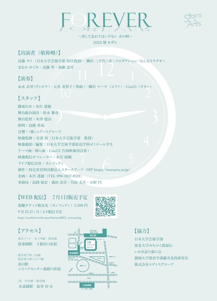 特定非営利活動法人スターズアーツ(理事長:本宮透雄)主催、『Forever~決して忘れてはいけない あの時~2023 刻 キザム』が2023年8月31日 (木)に文京シビックホール 小ホール(東京都文京区春日1丁目16-21)にて上演されます。