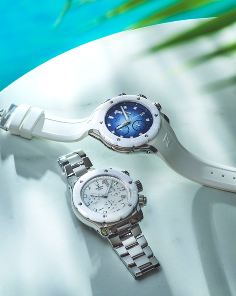 最高速度が時速200kmを超え海のF1とも称されるパワーボートレースの、ダイナミックかつラグジュアリーな世界観を投影した、エドックスのフラッグシップコレクション『クロノオフショア1』のレディースモデルです。