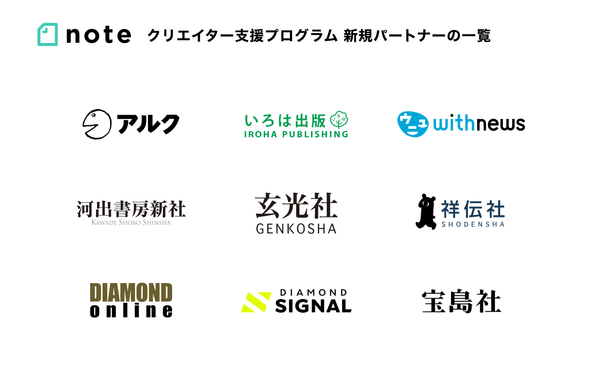 note株式会社は、noteクリエイター支援プログラムのパートナーシップをアルク、いろは出版、withnews、河出書房新社、玄光社、祥伝社、ダイヤモンド・オンライン、DIAMOND SIGNAL、宝島社(50音順、敬称略)と新たに締結しました。