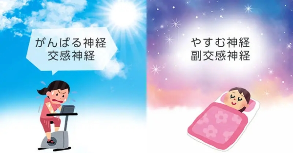 この自律神経は、交感神経(がんばる神経)と副交感神経(休む神経)で構成されており、どちらかが働けばどちらかは活動を弱めるようになっています。