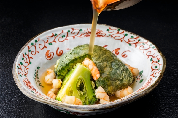 ブロッコリーをまるごと美味しく食べられるように、芯までやわらかく調理しています。ブロッコリーは、油との相性がよく、衣をつけて揚げることでより一層、旨味を感じられます。さらには、素材の良さを引き立てる熱々の和風の海老あんかけをかけることで、最後まで温かい状態で食べられる一品に仕上げました。