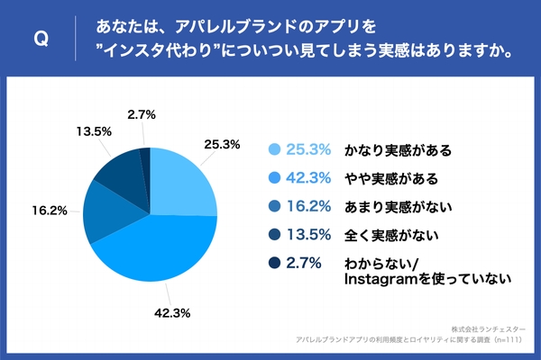 アパレルブランドのアプリを開く理由の結果から、情報収集のための利用のほか、「隙間時間を潰す」や「コーデスナップを見る」などただアプリ眺めるという回答も多いことが明らかに。そこで、「アパレルブランドのアプリをInstagramの代わりについつい見てしまう実感はありますか。」という質問をしたところ(n=111)、「かなり実感がある」が25.3%、「やや実感がある」が42.3%と、約7割がインスタ代わりに利用していることがわかった。