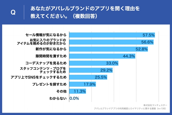 「アパレルブランドのアプリを週にどれくらいの頻度で開きますか。」という質問に対し、「全く開かない」と回答した人を除き、アパレルブランドのアプリを開く理由を尋ねたところ(n=106)、「セール情報が気になるから」が57.5%、「お気に入りのブランドのアイテムを眺めるのが好きだから」が56.6%、「新作が気になるから」が52.8%という結果となった。