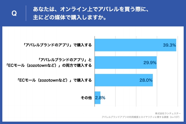 「オンラインで購入しない」と回答した3.6%の人を除き、集計したところ「アパレルブランドのアプリで購入する」が39.3%と最も高く、次いで「アパレルブランドのアプリ」と「ECモール(ZOZOTOWNなど)」の両方で購入するが29.9%という結果となった。