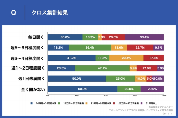 また、アパレルの年間購入額との関連性を調べたところ、アパレルブランドのアプリを「毎日開く」と回答した人の過半数が年間総額21万以上投資している一方で、「全く開かない」と回答した人の8割が年間総額21万未満であり、アプリの利用頻度が高い人はアパレルへの投資額も高い傾向がわかった。