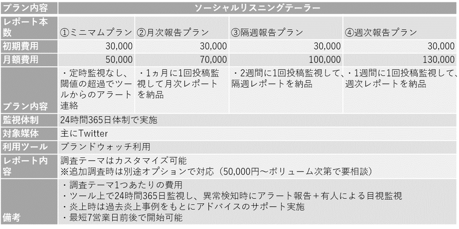これを受け、BTPは、SNS運用や風評対策に知見のない企業向けに、ソーシャルリスニングや競合調査、炎上リスク対策・対応までをローコストで運用をサポートする「ソーシャルリスニングテーラー」の提供を開始いたします。