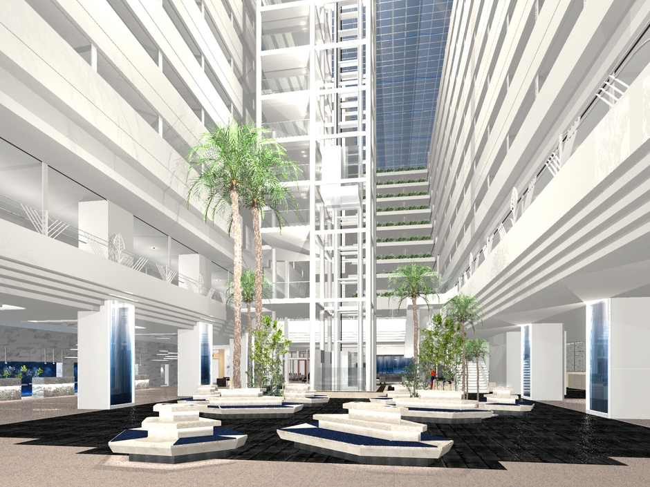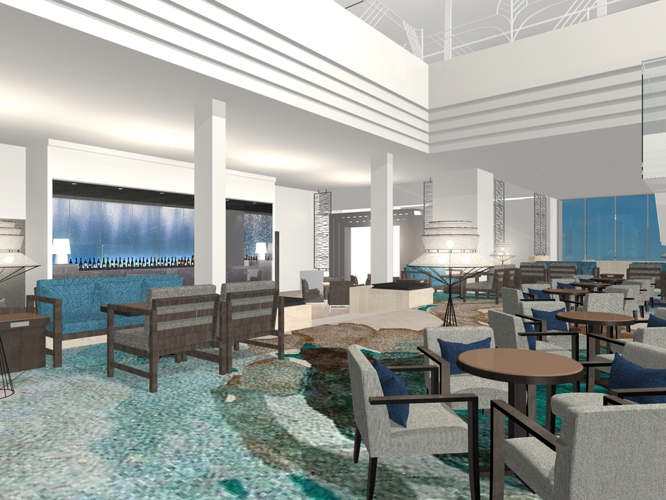 アトリウムから差し込む太陽の光に揺らぐ海底とサンゴをイメージした床面、カジュアルモダンな家具でリゾートらしいラウンジ空間にリニューアル。