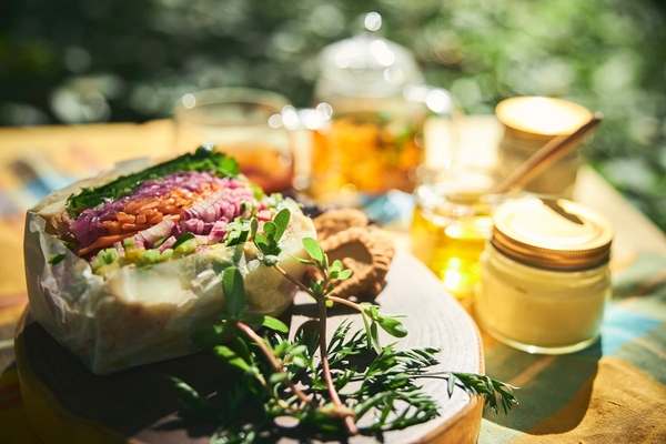 木洩れ日が差し込む森でピクニックを楽しみます。出発からしばらくすると「道草を食う」という言葉通り、馬は歩みを止め、辺りの草を食べて休憩します。広々と開放感のあるその場所は、「道草を食う」を叶える絶好の場所です。馬が道草をしている間に、参加者はプラン限定の「ピクニックBOX」を味わいます。セリや三つ葉などを使ったベジビエ*1特製の「草のサンドイッチ」や当ホテルのシェフが作ったオリジナルディップで食べる「道草サラダパック」、苦みや渋みが特徴の「草ティー」をセットにしました。無心で草を食べる馬と一緒に、ピクニックタイムを満喫します。