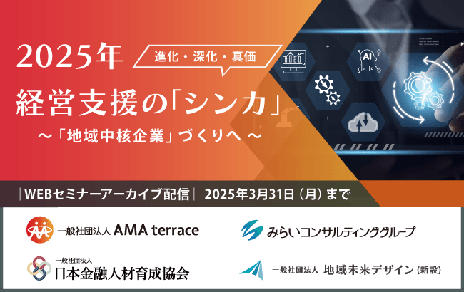 みらいコンサルティンググループ(本社:東京都中央区、代表:久保 光雄 岡田 烈司)は、2025年1月22日におこなったセミナー『2025年 経営支援の「シンカ」(進化・深化・真価)~「地域中核企業」づくりへ ~』をWEBにて2025年3月31日まで動画配信します。